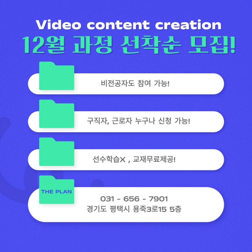 [평택컴퓨터학원] 더플랜용죽점 12월 영상콘텐츠 제작 국비과정 모집중 ~